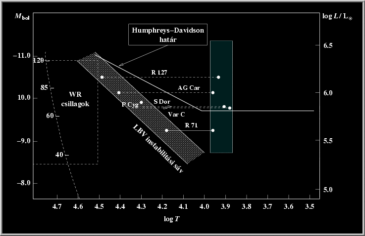 A szaggatott vonalak az LBV-k nyugalmi (o) és kitörési (+) fázisai közötti átmeneteket jelképezik. A diagramon fel vannak tüntetve a hideg szuperóriások is (x), illetve az empirikus Humphreys-Davidson határ (Humphreys és Davidson nyomán).