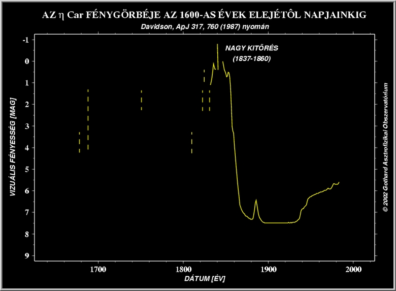 A ránk maradt megfigyelések reprodukciója szerint az 1600-as évek eleje és az 1800-as évek eleje között az η Car 2m és 4m között változtatta látszó fényességét. 1820 után azonban egy sokkal nagyobb fényességváltozás következett. Az 1830-as évek végére az η Car az égbolt egyik legfényesebb csillaga lett és 20 éven keresztül az is maradt, látszó fényességét +1m és -1m között változtatva. Végül 8m-ra halványodott, ahogyan a kitörés közben létrejött cirkumsztelláris anyag egyre jobban eltakarta. A kitörés közben kibocsátott összenergia egy szupernova robbanásáéval vetekedett, a csillag azonban túlélte az eseményt, s ma jól látható körülötte a ledobott anyag. A XX. század során az η Car újra elkezdett fényesedni, közben kis amplitúdójú fényesség-oszcillációkat produkált. Az egész emlékeztet egy gejzír vagy vulkán kitörési folyamatára: közepes aktivitás után egy heves kitörés, majd egy viszonylag csendes nyugalmi szakasz.
