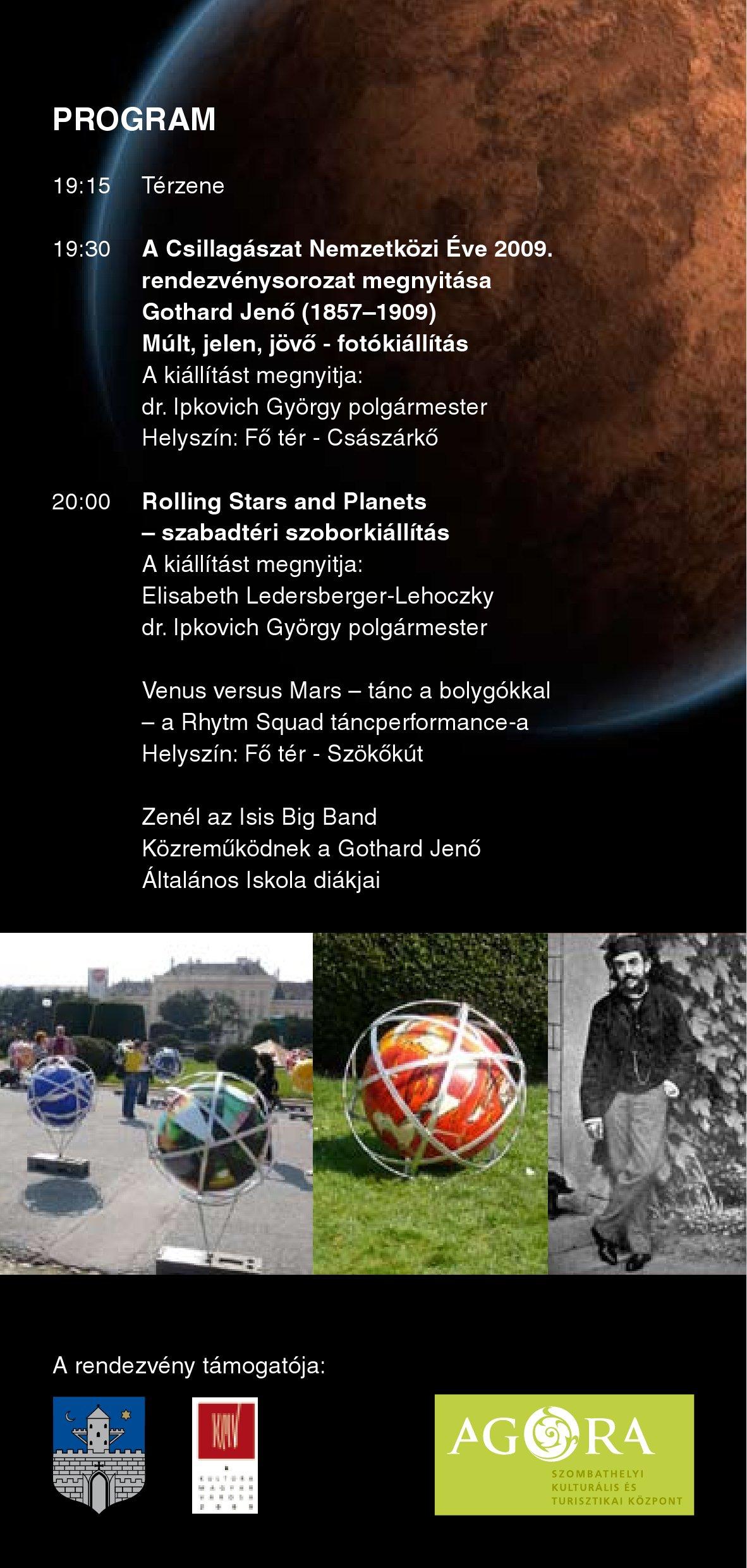 A programsorozat nyitórendezvényének Szombathely főtere adott otthont, ahol 2009. május 5-én 19:30-kor két kiállítást is megnyitott Dr. Ipkovich György, Szombathely MJV polgármestere és Elizabeth Ledersberger-Lehoczky szobrászművész. Az első a Gothard Jenő Általános Iskola diákjainak és tanárainak Gothard Jenő munkásságát bemutató "Múlt, jelen, jövő" c. fotókiállítása a Császárkő mellett, a második pedig a Ledersberger-Lehoczky művésznő által szervezett és vezetett nemzetközi alkotócsoport "Rolling stars and planets" c., Bécsben már bemutatott kompozícióegyüttese. Az égitesteket formázó gömböket a Gothard iskola diákjai gördítették a főtér közepén található szökőkút melletti virágoskertet körbefutó tartóikba.