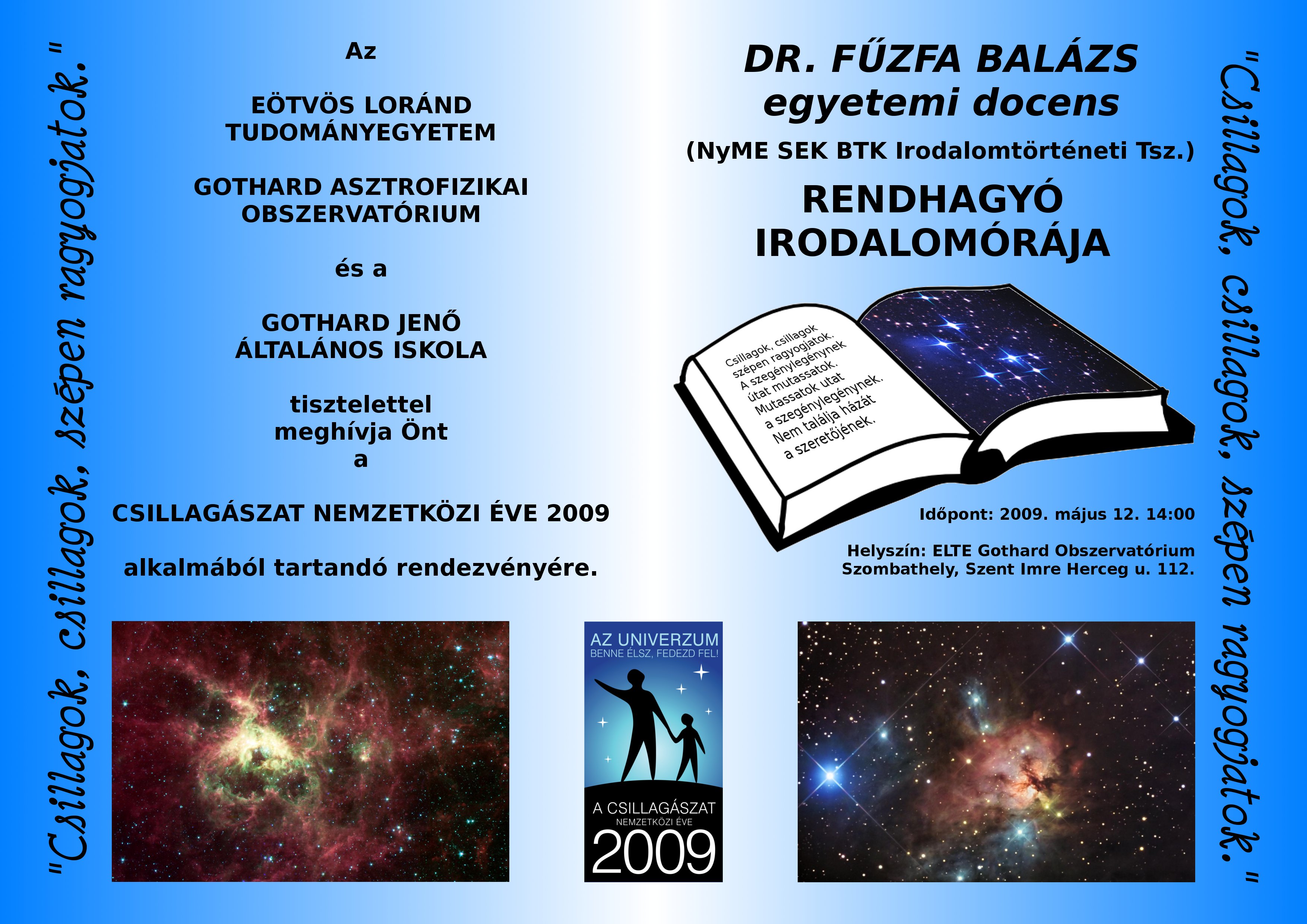 2009. május 12-én az ELTE Gothard Asztrofizika Obszervatóriumban, a Gothard Tudomány- és Technikatörténeti Állandó Kiállítás kiállítótermében Dr. Fűzfa Balázs egyetemi docens (NyME SEK BTK Irodalomtörténeti Tanszék) tartott rendhagyó irodalomórát "Csillagok, csillagok, szépen ragyogjatok." címmel a szombathelyi Gothard Jenő Általános Iskola diákjainak.