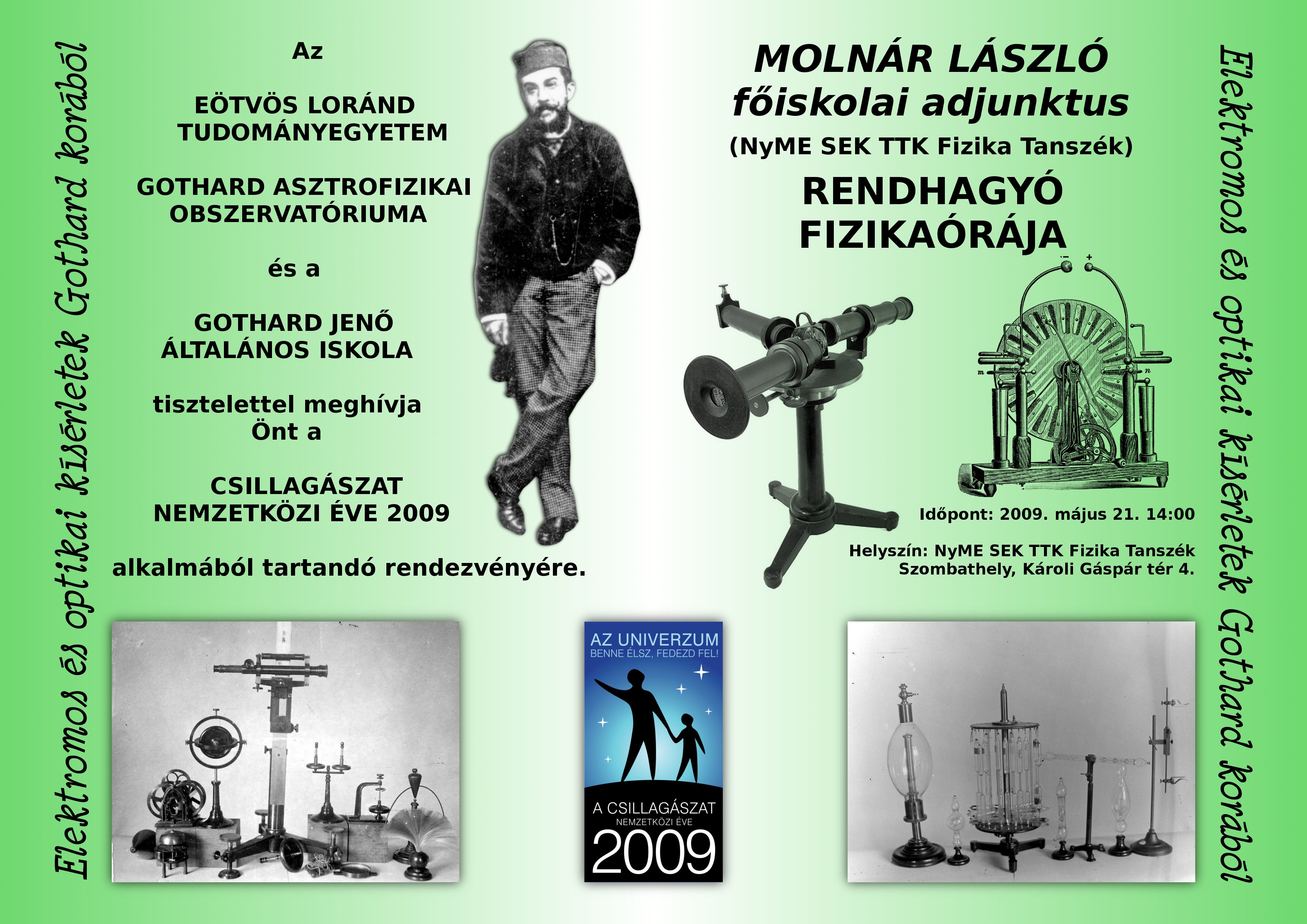 2009. május 21-én Molnár László, az NyME SEK TTK Fizika Tanszékének adjunktusa nagy érdeklődés mellett olyan elektromos és optikai kísérleteket mutatott be a Fizika Tanszék előadótermében, melyek fizikai alapjai már Gothard Jenő korában is ismertek voltak, s melyekhez hasonló kísérleteket maga Gothard is végezhetett, illetve végzett.