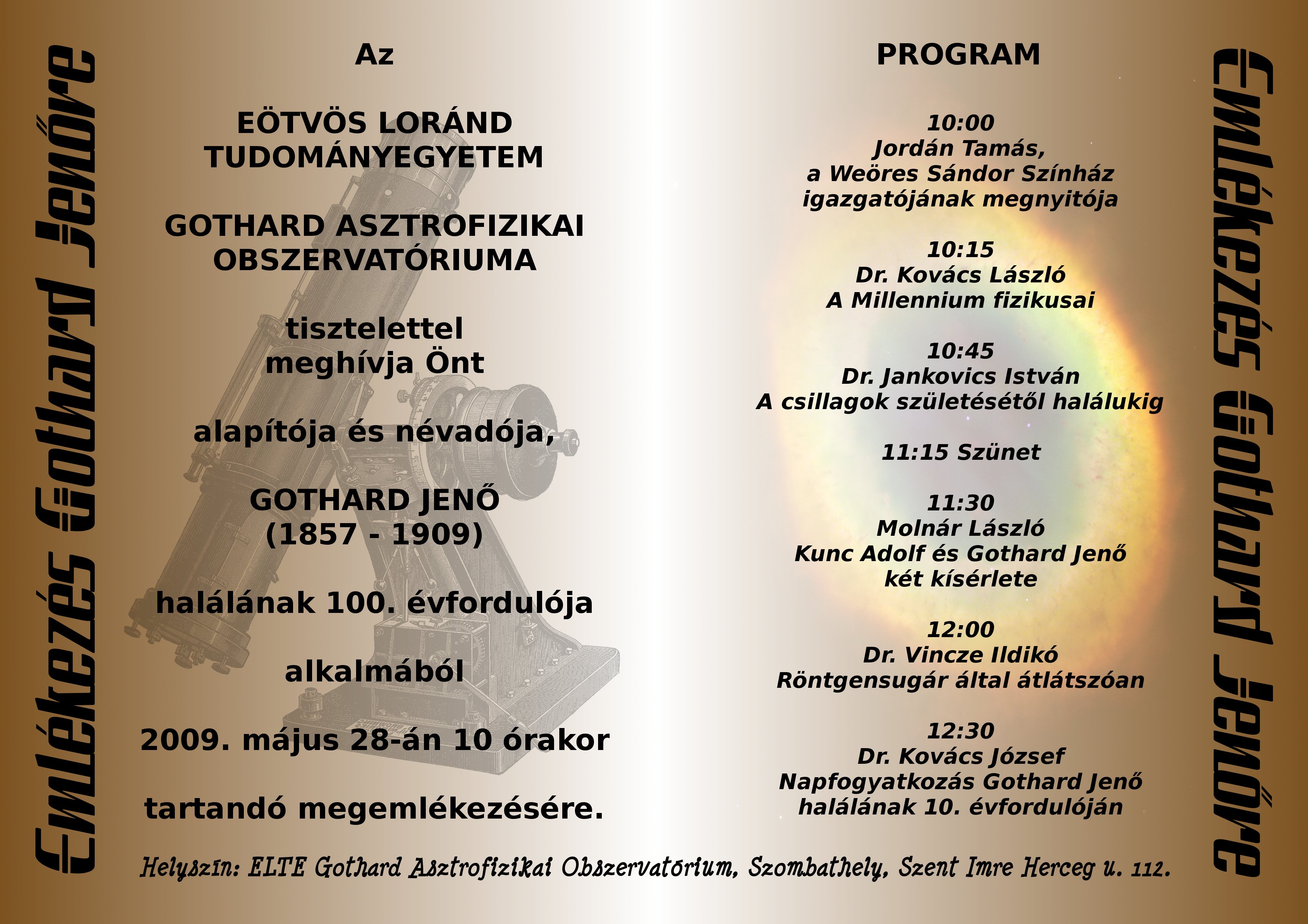 2009. május 28-án az ELTE Gothard Asztrofizikai Obszervatóriumában, a Gothard Tudomány- és Technikatörténeti Állandó Kiállítás kiállítótermében emlékülést rendeztünk az intézet alapítója és névadója halálának 100. évfordulója alkalmából. Az emlékülésen elhangzott előadások a korra jellemző momentumok felvillantásával tisztelegtek Gothard Jenő emléke előtt.