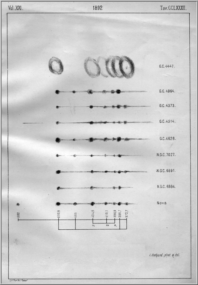 A Nova Aurigae és néhány planetáris köd spektruma.