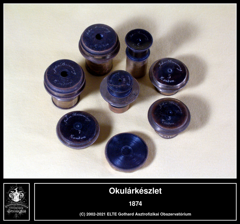 Az 1874-ben készült Browning-reflektorhoz tartozó, különböző nagyítású, szintén a londoni Browning cég által gyártott szemlencsék és egy Nap-üveg.